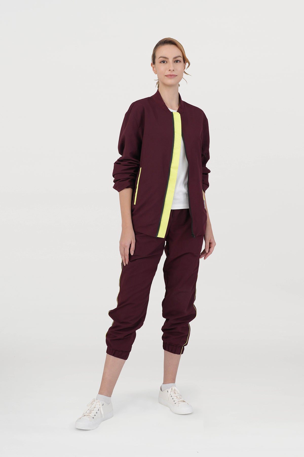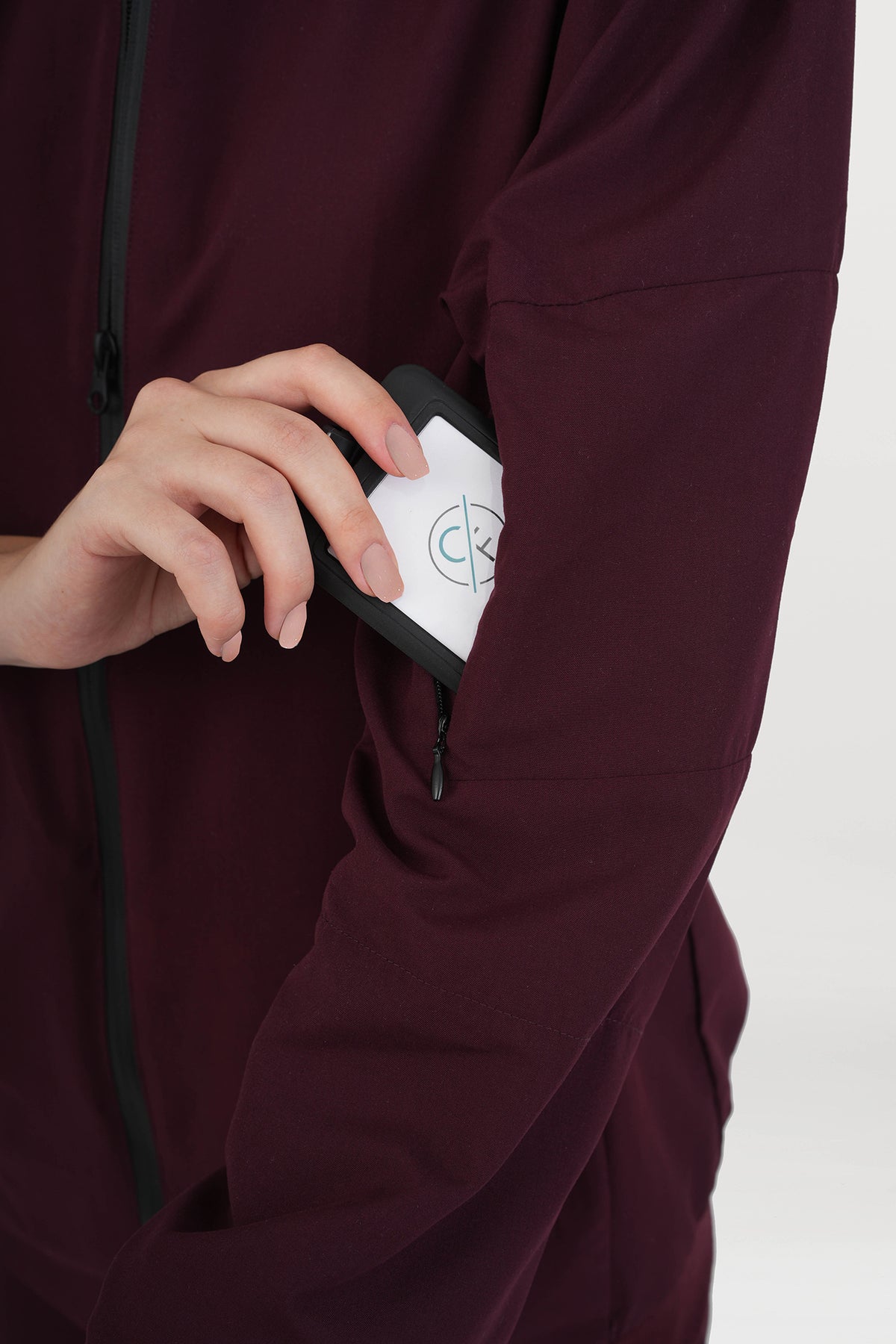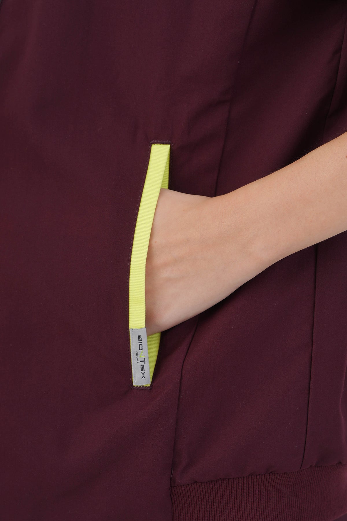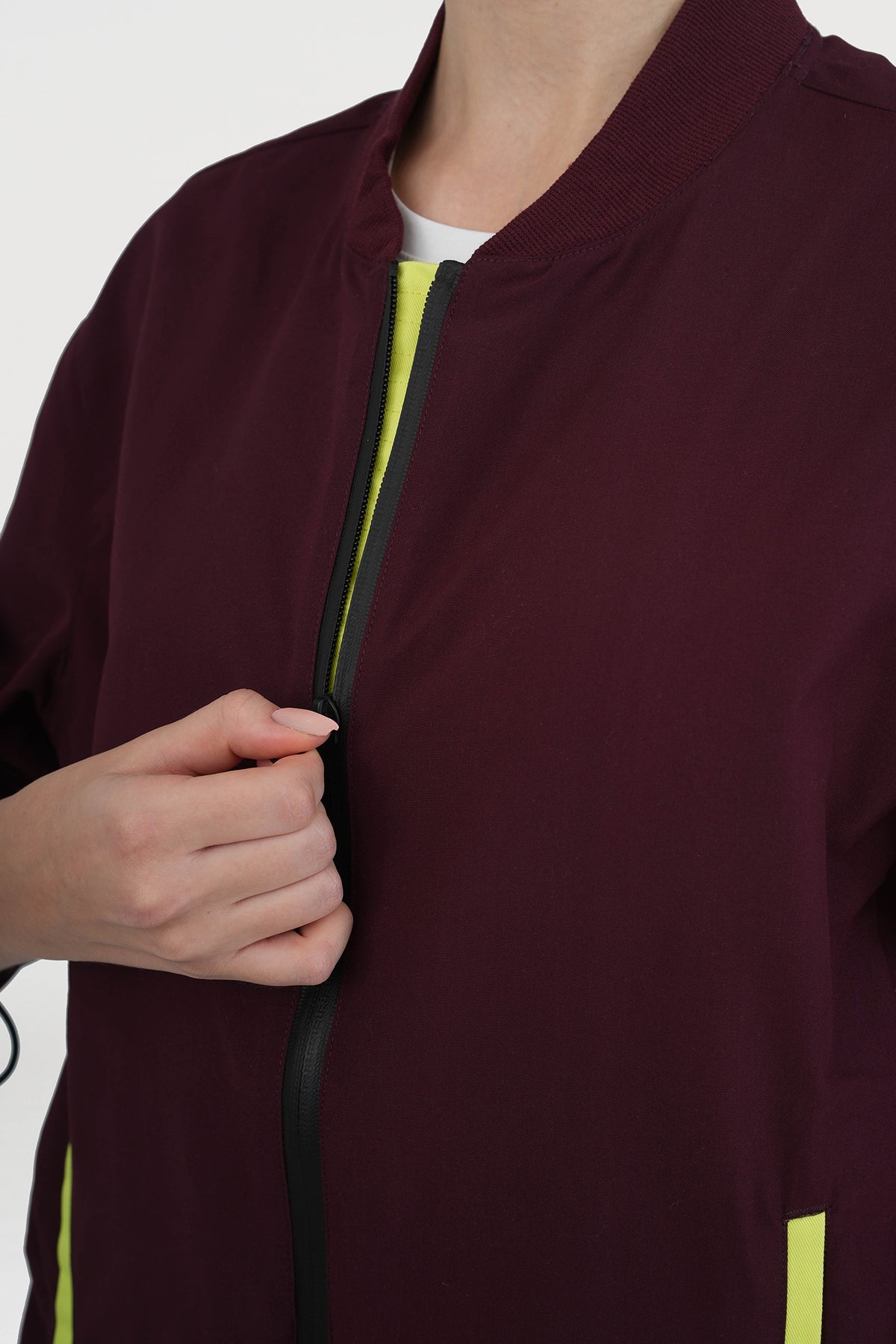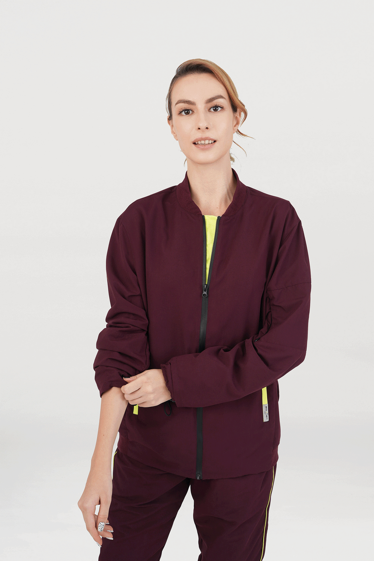 • Stand collar, zip front. Long sleeves, contrast color welt pockets at waist